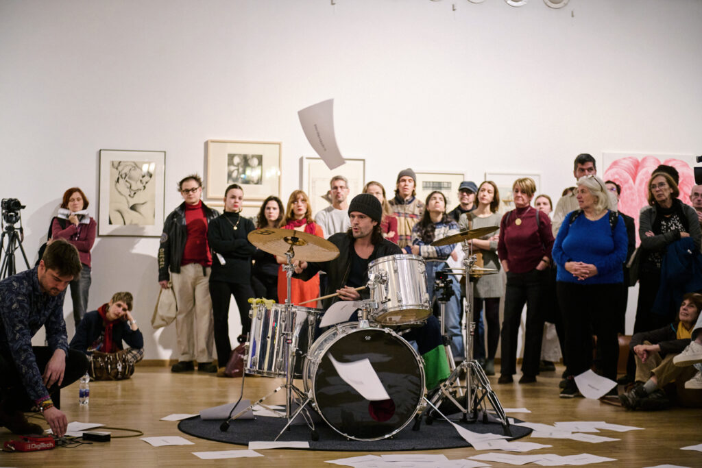 Freedom Trap (2023–) is a performance in a “counter-concert” format combining musical, rhythmic, and vocal elements. Bringing together performers from diverse fields, it stages two interrelated texts: a reinterpretation of Tibor Hajas’s Freedom Industry Broadcast, Channel IV (1973), followed by excerpts from secret-agent and police reports documenting his 1973 performance in Balatonboglár and the context of the Chapel Studio.